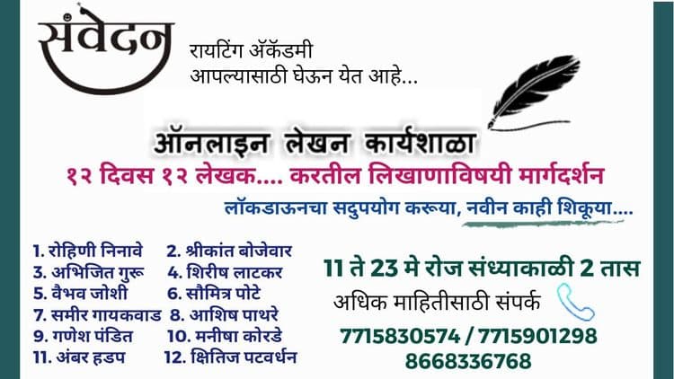 या बारा दिवसाच्या उपक्रमाची फी केवळ एक हजार रुपये ठेवलेली आहे कारण फक्त एकच… सध्या आपण ज्या लॉकडाऊन फेज मधून जात आहोत त्याचा सर्वांनाच काहीतरी सदुपयोग व्हावा. हजारो-लाखो रुपये घेऊन जे ज्ञान दिलं जात ते ऑनलाइन अगदी सामान्यातील सामान्य माणसालाही परवडेल अश्या किमतीत देण्यासाठी संवेदन रायटिंग अकॅडमी झटते आहे. आपल्या ओळखीच्या चांगलं लिहिणाऱ्या लिहू शकणाऱ्या पर्यंत हा संदेश पोहोचवायला विसरू नका.