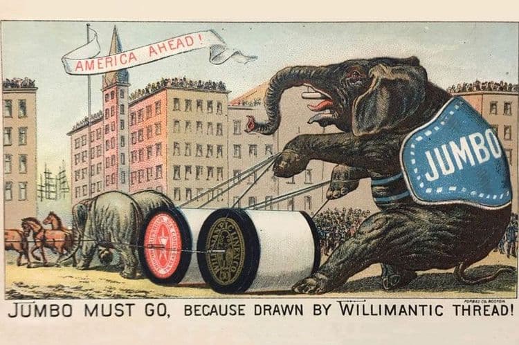 हा शब्द पहिल्यांदा १८८५ साली अमेऱीकेत अस्तित्वात आला. एका अमेरीकन सर्कशीत आफ्रिकेतून आणलेल्या एका हत्तीचं हे नाव होत. दुर्दैव असं की हा हत्ती रेल्वेलाइन पार करत असताना त्याला आगगाडीची धडक बसली आणि तो गेला. त्याचा मालक प्रसिध्दी तंत्रात फारच वाकबगार होता. त्याने त्या मेलेल्या हत्तीत भुसा भरून एका विद्यापीठाला भेट म्हणून दिला. हत्ती गेला, पण जंबो हा शब्द मात्र अमर झाला. त्यानंतर अनेक उत्पादनांना जंबो नाव देण्याची फॅशनच आली. परदेशात काय, भारतात काय, जंबो हे नाव ब्रँडसाठी आजतगायत वापरलं जातं.