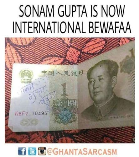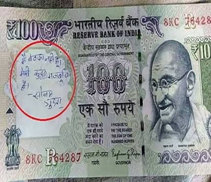 सद्या तुम्हाला प्रत्येकजण नव्या २०००च्या नोटेसोबतची आपली सेल्फी शेअर करताना दिसतोय. पण अशातच एका दहाच्या नोटेचा फोटोही वायरल झाला ज्यावर कोणीतरी पेनने लिहिलंय, "सोनम गुप्ता बेवफा है." आता ही बेवफा सोनम गुप्ता कोण आहे हेही कोणाला माहित नाही आणि तिच्या बेवफाईचा अशा पद्धतीने बदला घेणारा तिचा दिलजला आशिक कोण आहे हेही कोणाला माहीत नाही.