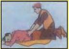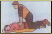 ४. सोबतच्या चित्रात दर्शविल्याप्रमाणे अपघातग्रस्तावर ओणवे व्हावे. त्याच्या पाठीवर छातीच्या पिंजऱ्याला बरगड्याच्या मागील बाजूच्या छोट्या भागावर दोन्ही हातांचे पंजे ठेवावे. हातांचे अंगठे जवळजवळ एकमेकांस स्पर्शतील व हाताची बोटे खालच्या बरगड्यांवर पसरून राहतील अशी ठेवावीत.