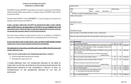 शिवाय, जर अशी काही गंभीर लक्षणे आढळलीच आणि हे गंभीर परिणाम लस दिल्यामुळेच उद्भवले आहेत, हे जर सिद्ध झाले तर याबदल्यात संबधित कंपनी म्हणजेच भारत बायोटेक आवश्यक ती भरपाई करेल असेही या संमती पत्रावर नमूद करण्यात आले आहे. केंद्रीय नीतिशास्त्र समिती ही नुकसान भरपाई किती आणि कोणत्या स्वरुपात असेल हे निश्चित करेल.”