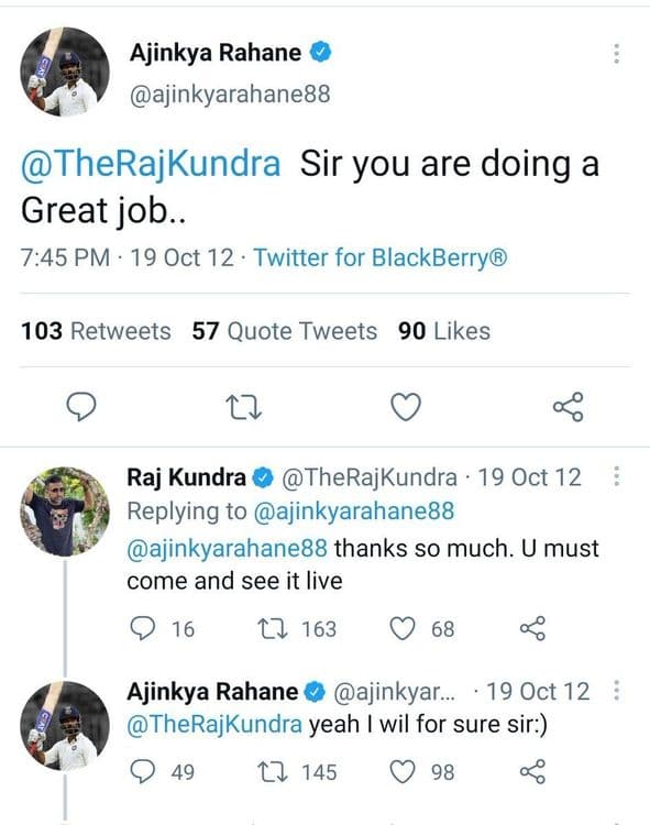 राज कुंद्रा राजस्थान रॉयल्सचा मालक असल्याने तो क्रिकेटशी देखील संबंधित आहे. तर राज कुंद्रा आणि रहाणे यांच्यामध्ये २०१२ साली ट्विटरवर झालेले संभाषण लोकांनी बाहेर काढले आहे. यावरून रहाणे मात्र चांगलाच ट्रोल झाला आहे.