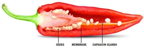 ५. मिरचीच्या आत असलेल्या पांढऱ्या-मांसल भागात कॅपसेसिन सर्वात जास्त असते, तर बियांमध्ये कमी असते.