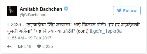 १९ फेब्रुवारीला तारखेप्रमाणे शिवजयंती साजरी करण्यात आली. देशभरात विविध कार्यक्रमातून शिवरायांना अभिवादन करण्यात आलं. याच निमित्तानं पंतप्रधान ‘नरेंद्र मोदी’ आणि बिग बी ‘अमिताभ बच्चन’ यांनी ट्वीट करून शिवजयंतीच्या शुभेच्छा दिल्या. विशेष म्हणजे या दोन्ही दिग्गजांनी आपले ट्विट मराठीतून केले आहे.