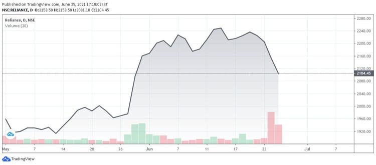 काल रिलायन्स इंडस्ट्रीजची वार्षिक सर्वसाधारण सभा पार पडली. त्या अगोदरच्या चार दिवसात कंपनीच्या शेअरचे भाव वरवर चालले होते. काल जशी वार्षिक सर्वसाधारण सभा संपत आली तसे शेअरचे भाव पडायला सुरुवात झाली. आज सकाळी हा लेख लिहित असताना कालच्या २१४८ रुपयाच्या गच्चीवरून हा शेअर बर्याच पायर्या खाली उतरला आहे. गेल्या महिन्याभरात या शेअरचा भाव जवळजवळ ३०० रुपये वर गेला आणि काल एका दिवसात २% खाली आला.
