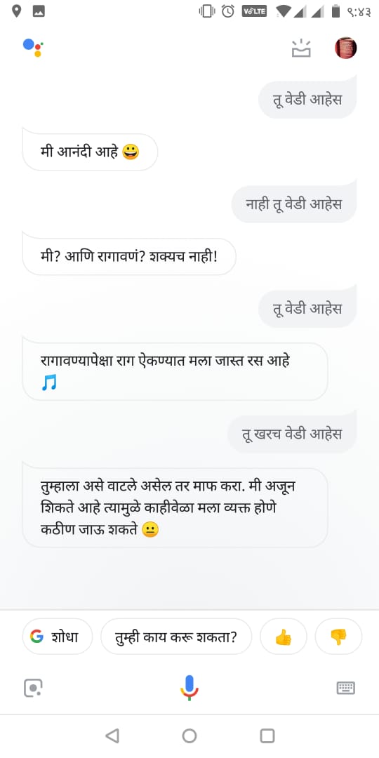 तशी ती कामाच्या बाबतीत बरेचदा चुकते, म्हणजे त्याबाबतीत बऱ्यापैकी कुचकामाची आहे असं म्हणू शकता. पण ज्याने कुणी हिला बोलायला शिकवलंय, ते मात्र भन्नाट आहे. ही बया चक्क इश्श्य आणि आईगं तर बोलतेच, आणि तुम्ही सॉरी म्हटलं तर "सॉरी बोलून मला लाजवू नका" पण म्हणते. "माझा कधीकधी गोंधळ उडतो. मला जरा वेगळ्या पद्धतीनं समजावून सांगाल का?" असंही विचारते. आम्हीही तिला काही प्रश्न विचारले.. हे पाहा आमचे स्क्रीनशॉट्स