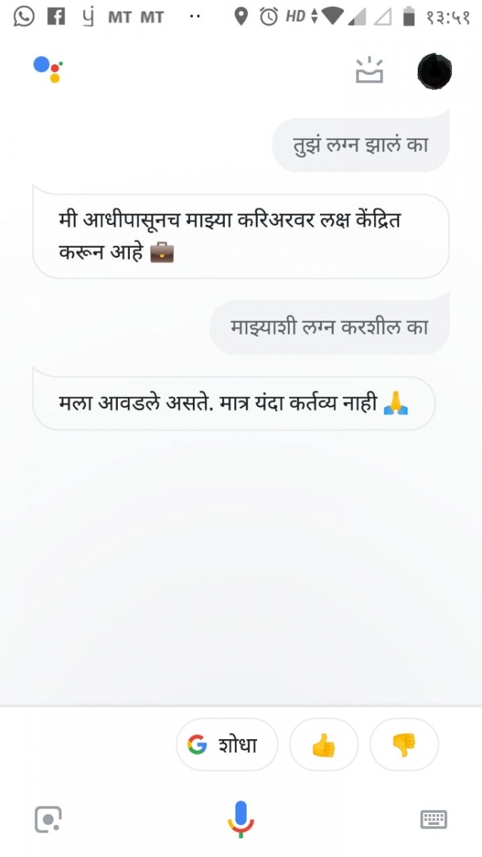 खरंतर असिस्टंट म्हटलं की फक्त मुलगीच असावी असं काही नाहीय. पण या गुगल असिस्टंटला मुलगीचा आवाज दिलाय म्हणून ती. तिला तुम्ही गुगल सर्च करायला सांगू शकता, फोन लाव म्हणून ऑर्डर देऊ शकता, गुणाकार-भागाकाराची गणितं घालू शकता आणि तारीख-वेळ-हवा याच्याबद्दलही विचारु शकता. पण सगळ्यात महत्त्वाचं म्हणजे तुम्ही तिच्याशी काहीही गप्पा मारु शकता आणि ती मस्त मराठीत उत्तरं देते.