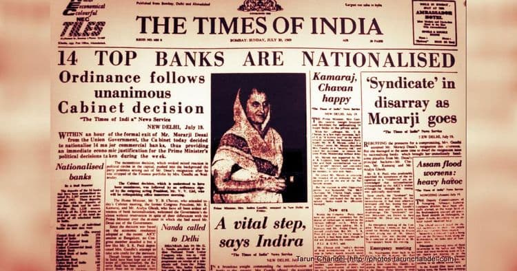 एकेकाळी देशातल्या बहुसंख्य बँका वेगवेगळ्या उद्योग समूहांकडेच होत्या. पण १९६९ साली त्यांचे रातोरात राष्ट्रीयीकरण करण्यात आले होते. बोभाटाच्या अनेक वाचकांना ५० वर्षांपूर्वी काय घडले होते याची कल्पना नसेल म्हणून आजच्या लेखात आपण राष्ट्रीयकरण, त्यासोबत जोडले गेलेले राजकारण, सत्तेत असलेल्या काँग्रेस पक्षाचे दुभाजन या सर्व मुद्द्यांचा आढावा घेणार आहोत.