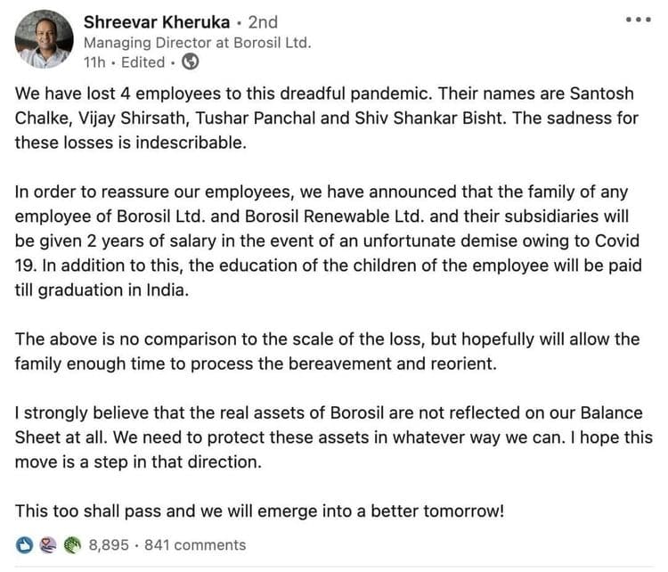 कंपनीचे मॅनेजिंग डायरेक्टर श्रीवार खेरुका यांनी लिंकडीनवर पोस्ट करून सांगितलं की मृत झालेल्या कर्मचाऱ्यांच्या घरच्यांना पुढची २ वर्षे नियमितपणे पगार मिळत राहील. एवढंच नाही तर या कर्मचाऱ्यांच्या मुलांच्या पदवीपर्यंतच्या शिक्षणाची जबाबदारी कंपनी घेणार आहे. श्रीवार खेरुका यांनी दिलेली माहिती खालील पोस्टमध्ये पाहा.