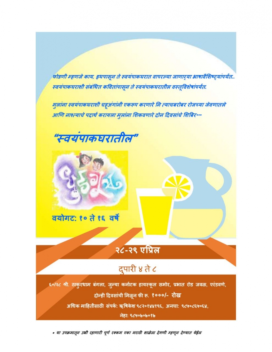 वर दिलेल्या वेगवेगळ्या माहितीसह मुलं या शिबिरात रोजचं शाकाहारी जेवण आणि काही नाश्त्याच्या पदार्थांशी दोन हात तर करतीलच, त्याच सोबत विरजण लावण्यापासून, काकड्या चोचवण्यापर्यंत आणि कणीक मळण्यापासून कुकर लावण्यापर्यंत अनेक बाबी शिकून स्वयंपूर्ण होतील .