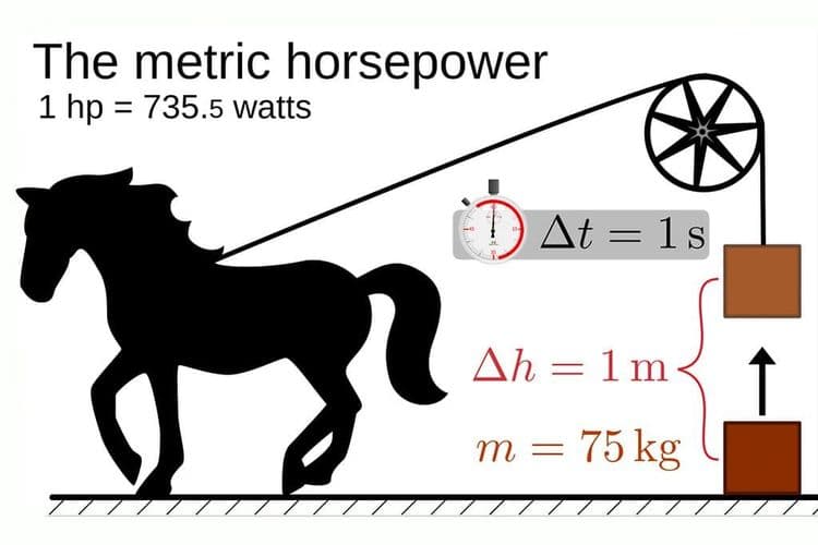 एक मेट्रिक हॉर्सपॉवर = ७३५.४९६७५ वॅट्स (७५ किलोग्रॅम वजन एका सेकंदात एक मीटर ओढणे)
