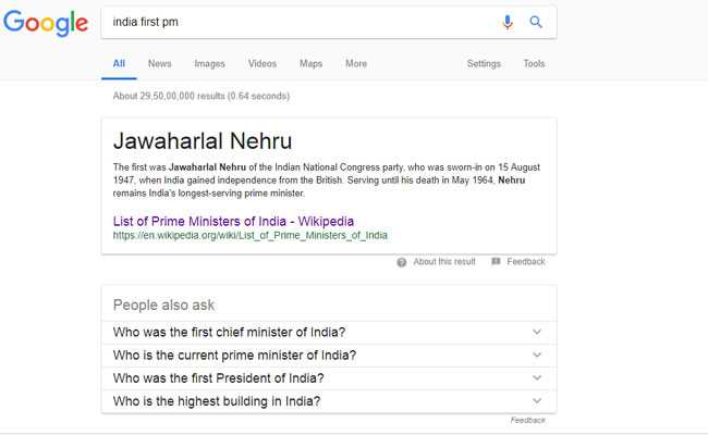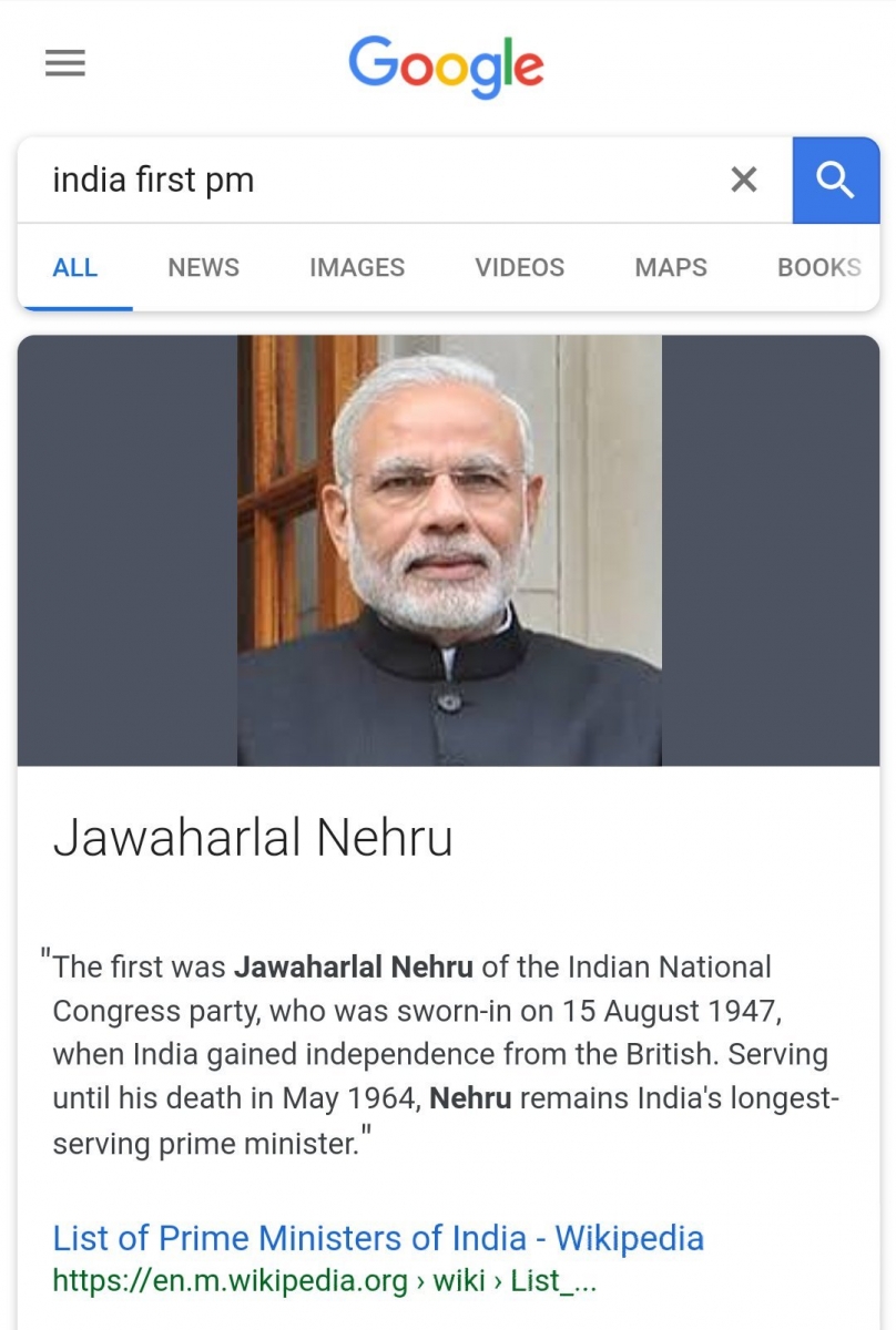 भारताचे पहिले पंतप्रधान कोण असा सर्च केल्यावर आपल्या समोर कोणाचा फोटो येईल राव ? अर्थात जवाहरलाल नेहरू यांचा. पण सध्या गुगलचा गोंधळ उडालेला दिसतोय. कारण India first PM असा सर्च केल्यानंतर चक्क नरेंद्र मोदी यांचा फोटो येतोय.