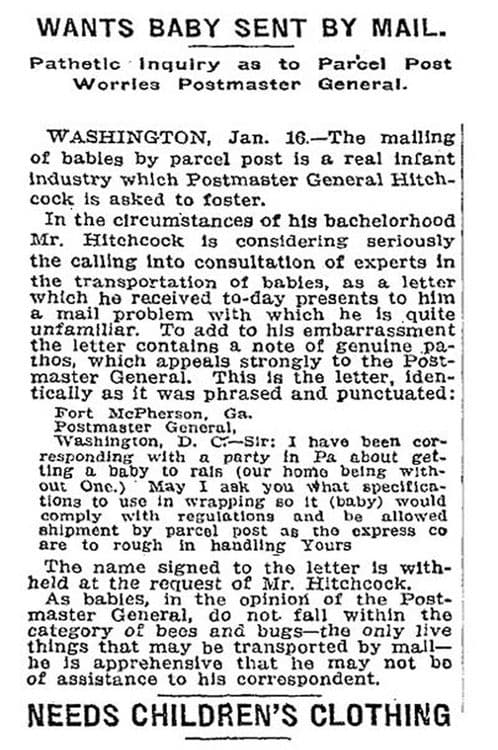 पार्सल पोस्टाची सुरुवात झाल्यानंतर काही दिवसांतच ओहायोमध्ये राहणार्या जेस आणि माटिल्डा बीगल यांनी आपला आठ महिन्यांचा मुलगा जेम्स याला केवळ काही मैलांवर राहणार्या त्याच्या आजीकडे पाठवलं. त्यावेळी पार्सल पोस्टातून ११ पौंडांपर्यंत वजन असलेलं पार्सल पाठवायची परवानगी होती आणि जेम्स बाळाचं वजन त्यापेक्षा थोडंसंच कमी होतं. केवळ १५ सेंट्समध्ये हे काम झालं. अर्थात त्याच्या आईवडलांनी त्याचा ५० डॉलर्सचा विमा काढला होता. या बातमीने वर्तमानपत्रात मथळे गाजवले आणि पुढचे अनेक महिने या आणि अशा बातम्या मग येतच राहिल्या.