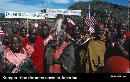पण केनियाने अशा प्रकारे आपल्या कुवतीनुसार (इतरांच्या दृष्टीने अगदीच किरकोळ) मदत करणं हे पहिल्यांदाच घडलेलं नाही. मुळात हा आफ्रिकेतला गरीब, अप्रगत देश. जेव्हा अमेरिकेवर ११ सप्टेंबर २००१ रोजी दहशतवादी हल्ला झाला तेव्हा केनियाने मदत म्हणून अमेरिकेला १४ गायी दिल्या होत्या. केनियातील मसाई लोकांच्या दृष्टीने गाय हे जणू देवाचं रूप. या लोकांची संपत्ती म्हणजे त्यांच्याकडे असलेलं पशुधन. तिकडे गायीगुरं जास्त असलेली व्यक्ती श्रीमंत गणली जाते. केनियाने गायींच्या रूपाने आपल्या संपत्तीतला काही वाटाच अमेरिकेला देऊ केला.