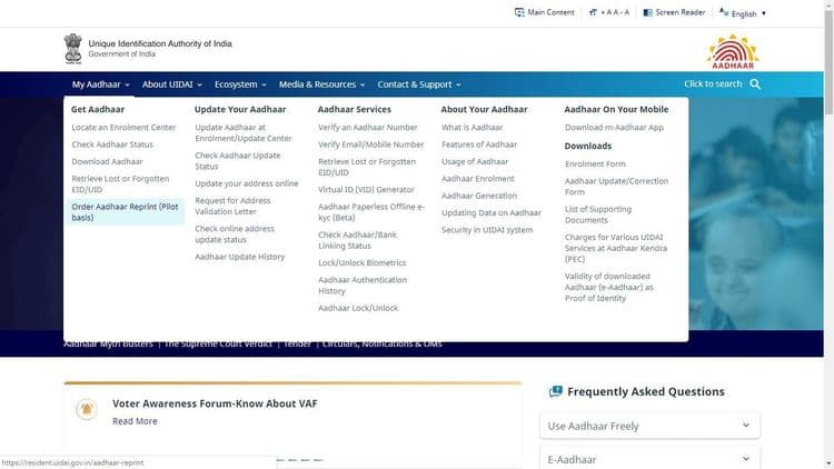 २. ‘My Aadhaar’ मेन्यूवर क्लिक करून ‘Aadhaar Reprint' वर क्लिक करा.
