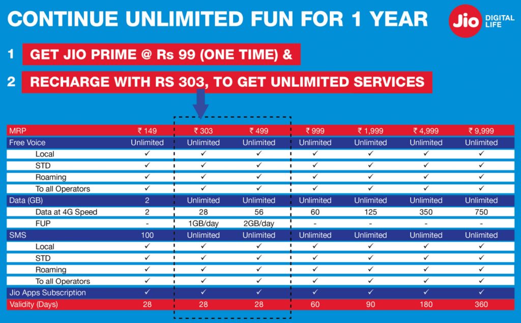 जीओची नवी प्राईम मेम्बरशीप घेण्यासाठी तुम्हाला एका वर्षाचे ९९ रूपये भरावे लागतील. ते तुम्ही जीओ वेबसाईट, अॅप कींवा जीओ-केअर मधून भरू शकता. आणि तेही मार्च संपायच्या आत. एकदा का तुम्ही जीओचे प्राईम मेम्बर झालात की तुम्ही खालील पैकी हवा तो प्लान वापरू शकता. प्राईम मेम्बर्ससाठी मोफत एसएमएस आणि कॉल्स ची सुविधा सुरूच राहील.