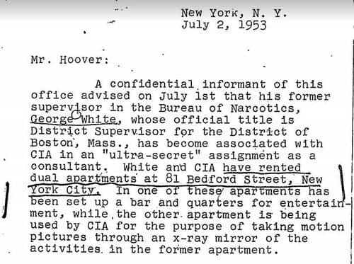 याचा पुरावा खाली दिलेल्या चित्रात दिसतो आहे. या मेमोत असं म्हटलंय, "श्रीमान हूवर (एफबीआय प्रमुख), विश्वसनीय सूत्रांकडून असे समजते आहे की ब्यूरो ऑफ नार्कोटीक्स या एफबीआयच्या विभागात काम करणारा जॉर्ज व्हाइट आता सीआयएसोबत काम करतो आहे. त्याने आणि सीआयएने ८१/ ब्रेडफोर्ड स्ट्रीटवर एक जुळा फ्लॅट भाड्याने घेतला आहे. एका फ्लॅटमध्ये मनोरंजनाची व्यवस्था करण्यात आली आहे आणि दुसर्या फ्लॅटच्या एक्स रे मिररमधून त्या मनोरंजनाचे चित्रीकरण करण्यात येते."