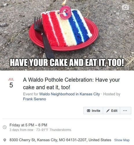 मंडळी, फ्रँकने फेसबुक इव्हेंट तयार करून ३ महिने पूर्ण झाल्याबद्दल खड्ड्याचा वाढदिवस साजरा केलाय. त्याने लिहिलं की “मी केक आणि मेणबत्त्या आणल्या आहेत. खड्ड्याच्या जन्मदिनानिमित्त छोटीशी पार्टी पण अरेंज केली आहे.”