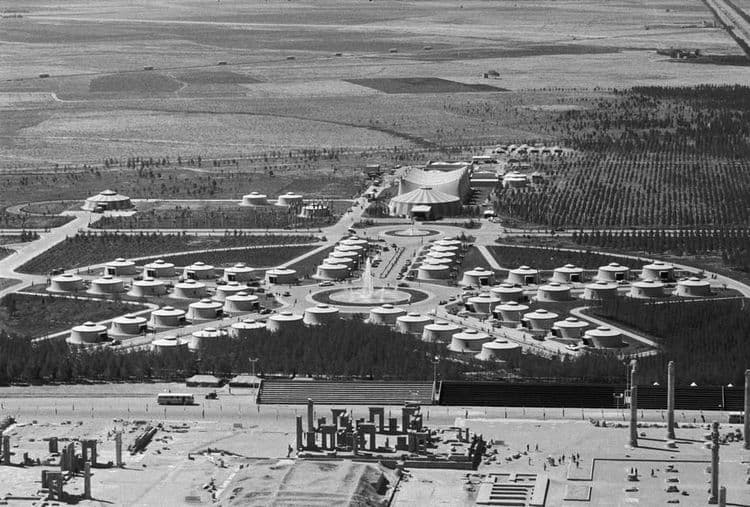 या संपूर्ण घटनेलाच एक प्रकारचं बनावटी रूप होतं. याची प्रचिती तुम्हाला पुढे येईलच. सुरुवात झाली ती उत्सवासाठी निवडलेल्या जागेपासून. पर्सेपोलीसचं वाळवंट हे उजाड होतं, तिथे ना झाडं होती, ना उत्सव करण्यालायक वातावरण. साप विंचूसारखे प्राणी मात्र भरमसाठ होते. शाह पेहलवीने तिथला नूरच बदलला. पाहुण्यांच्या जीवावर उठतील असा एकही प्राणी नको म्हणून विषाची फवारणी करण्यात आली. मेलेल्या प्राण्यांना तिथून साफ करण्यात आलं. काही दुर्मिळ प्राणी परीक्षणासाठी शास्त्रज्ञांकडे पाठवण्यात आले. जमीन साफ झाल्यावर एकूण ५० तंबू उभारण्यात आले. हे काम फ्रान्सच्या मेसन आणि जेन्सन या इंटिरियर डिझायनर कंपनीला देण्यात आलं होतं. या कंपनीने १६० एकर जमिनीवर तंबू उभारले. तंबूसाठी रेशीम वापरलं. किती लांब? तर तब्बल ३७ किलोमीटर लांब. जगातल्या ५ खंडांचं प्रतिनिधित्व करणाऱ्या ५ रांगा आखण्यात आल्या. मधोमध कारंजेही होते. हा फोटो पाहा.