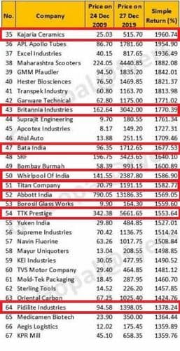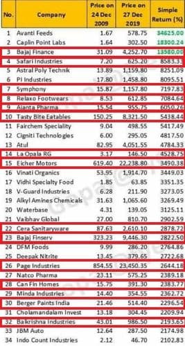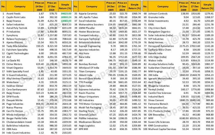 या १०० समभागाच्या यादीत पहिला समभाग आहे अवंती फीड्स नावाच्या कंपनीचा! २००९ साली या कंपनीचे समभाग रु. १.६७ या किंमतीत उपलब्ध होते. समजा, तुम्ही तेव्हा १००० समभाग घेतले असते तर एकूण गुंतवणूक झाली असती रुपये १६७०! दहा वर्षे ही गुंतवणूक तशीच ठेवली असती तर आताच्या घडीस तुमच्या हातात ५,७८,७५० रुपये जमा असते . याच यादीत शेवटचा समभाग आहे मूथूट कॅपिटल या कंपनीचा! हे समभाग घेतले असते तरी मुद्दल दहापट झाले असते ! पण मग सगळ्या गुंतवणूकदारांचा असाच फायदा का होत नाही? हा प्रश्न मनात येणे साहजीकच आहे.