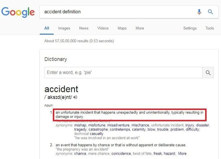 मंडळी, हा पूर्ण काळ ही संपूर्ण केस एकाच मुद्द्याभोवती फिरत होती, तो म्हणजे 'डास चावून मलेरिया होऊन झालेला मृत्यू हा अपघाती मृत्यू ठरतो का?' न्यायालयासमोर दोन्ही बाजूंनी अनेक दावे केले गेले, बऱ्याच इतर केसेसचे दाखले दिले गेले. मग एकदा कधीतरी न्यायालयाने ‘अपघात’ या शब्दाचा मान्यताप्राप्त शब्दकोशातील अर्थ बघितला. तर तिथे या शब्दाची व्याख्या ‘अपघात म्हणजे अचानक घडलेली आणि पूर्वनियोजित नसलेली घटना’ अशी होती.