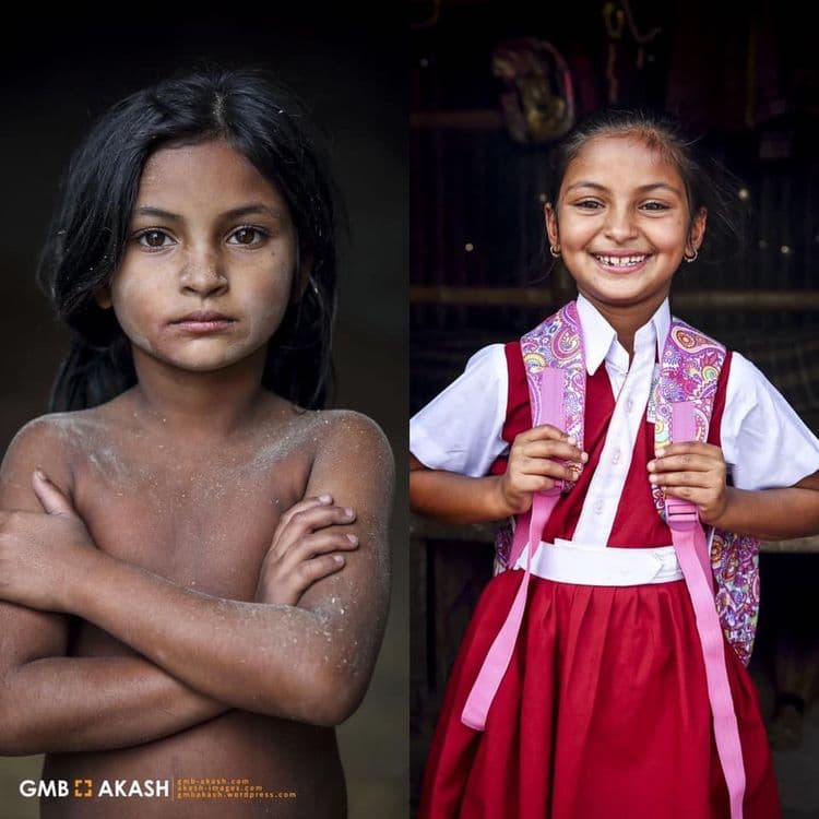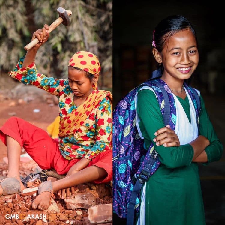 शिक्षण हा मुलांचा मुलभूत हक्क आहे. प्रत्येक मुलाला शिक्षण हे मिळालंच पाहिजे, पण काही मुलांना शिकण्याच्या वयातच मजुरी करावी लागते. दोन वेळच्या अन्नाची चिंता नसलेल्या वयात त्यांना काम केलं तरच दोन वेळचं अन्न मिळणार असतं. या मुलांना शिक्षण मिळावं म्हणून अनेक संस्था, समाजसेवक काम करत असतात. बांगलादेशमधल्या GMB Akash नावाच्या फोटोग्राफारने देखील बालमजुरांना शाळेत पाठवण्याची मोहीम हाती घेतली आहे. तो मुलांच्या आईवडिलांची परवानगी घेऊन जमेल तेवढ्या मुला-मुलींना शाळेत पाठवण्याचं काम करतो. फोटोग्राफर असल्याने त्याने मुलांचं शाळेत जाण्यापूर्वीचं आणि नंतरचं रूप कॅमेऱ्यात टिपलंय.