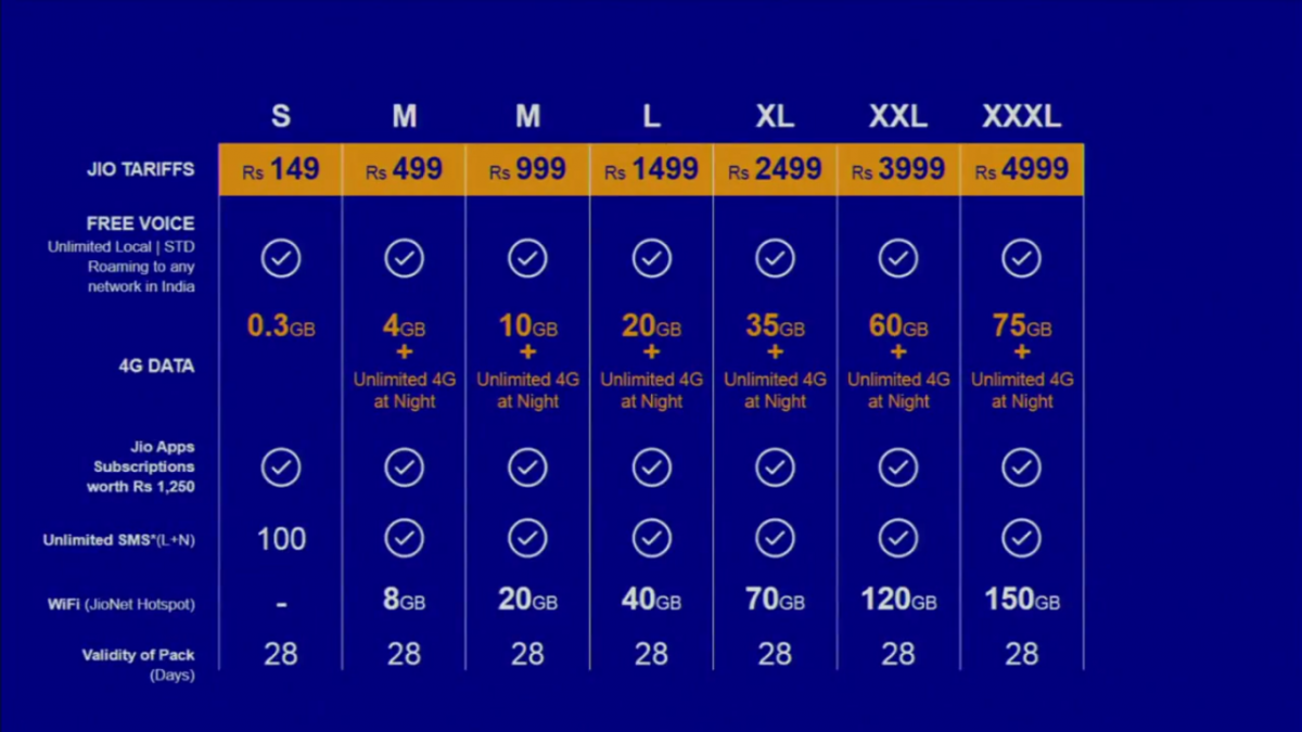 500 रुपयांमध्ये, मोफत फोन कॉल्स, एस एम एस, 4GB डेटा, रात्री डेटा फ्री, पब्लिक वाय-फायवर 8 जीबी डेटा. इतकंच नाही तर रिलायन्सने गाणी, मुव्हीज स्ट्रीम करणारी ऍप्स बनवली आहेत. त्याचा पण ऍक्सेस फ्री असणार आहे. अर्थात नेटवर्कची क्वालिटी काय असणार हे थोड्या दिवसात कळेलच...