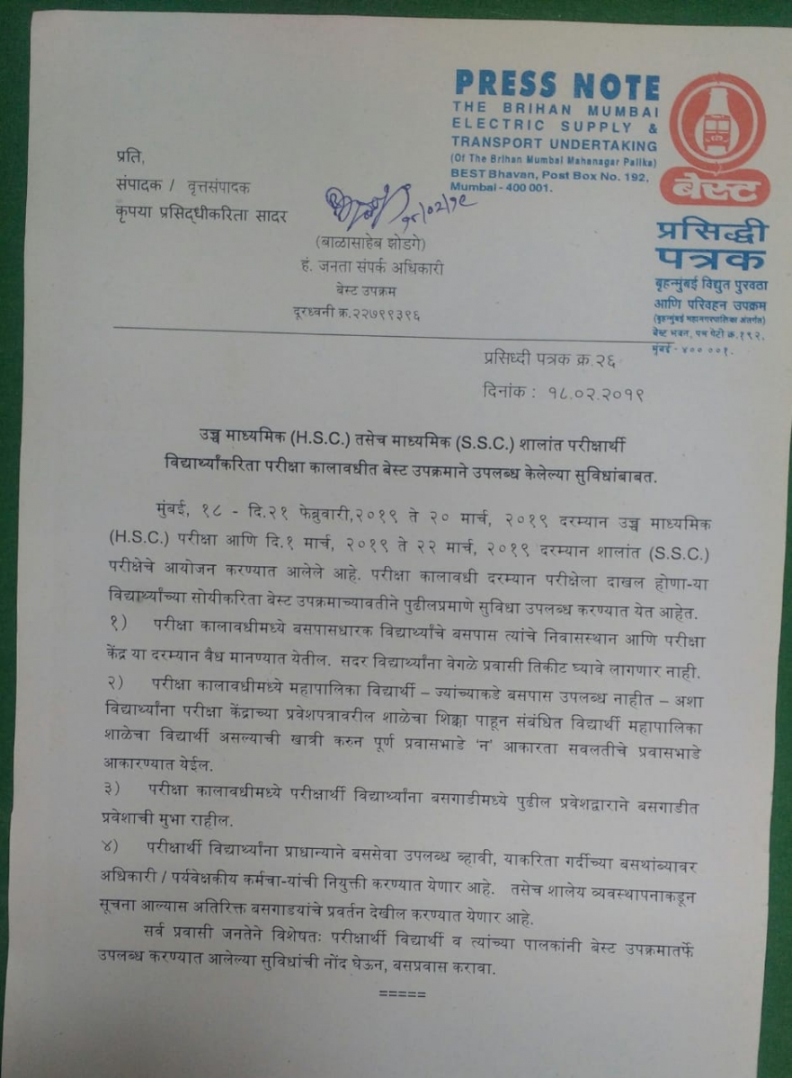 बेस्टने बोर्डच्या परीक्षेला बसणाऱ्या विद्यार्थ्यांसाठी मोफत बस सेवेत महत्वाचे बदल केलेत. तसं विशेष परिपत्रक काढण्यात आलंय. ज्या विद्यार्थ्यांकडे बस पास आहे त्या विद्यार्थ्यांना हा पास त्यांच्या घरापासून ते परीक्षा केंद्रापर्यंत सर्व बसेससाठी वापरता येईल. त्यांना वेगळं तिकीट काढावं लागणार नाही. महानगरपालिकेच्या ज्या विद्यार्थ्यांकडे बस पास नाही त्यांना हॉल तिकीटवरचा शाळेचा शिक्का दाखवून मोफत प्रवास करता येणार आहे.