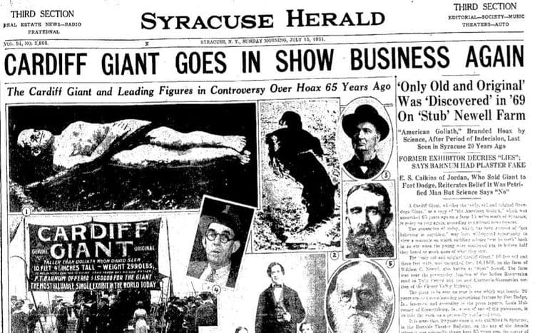 चला तर गोष्टीला सुरुवात करूया. औद्योगिक क्रांतीच्या सुरुवातीच्या काळात जाऊ. औद्योगिक क्रांतीतून जन्माला आलेल्या नव्या तंत्रज्ञानाचा आणि संशोधनांचा वापर करून काही भामट्यांनी लोकांना फसवण्याचा उद्योग सुरु केला होता. त्यातीलच एक मोठं उदाहरण म्हणजे ‘Cardiff Giant’.
