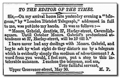 मे १८६४ साली ब्रिटन मधल्या काही राजकारण्यांना एक टेलिग्राम आला. त्यांनी टेलिग्राम पाहिला. ते एक पाकीट होतं आणि त्याच्या आत एक चिठ्ठी होती. राजकारणी असल्याकारणाने त्यांना साहजिकच वाटलं की चिट्ठीत नक्कीच महत्वाचा मजकूर असणार. पण राव, त्याजागी चक्क एक जाहिरात निघाली. ही जाहिरात होती “Messrs Gabriel” नामक एका दाताच्या दवाखान्याची आणि मेसेज मध्ये लिहिलं होतं, “दवाखाना ऑक्टोबर पर्यंत सकाळी १० ते संध्याकाळी ५ वाजेपर्यंत चालू राहील”