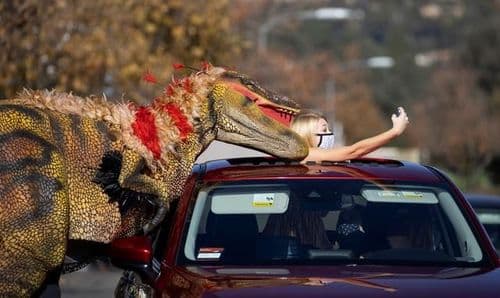 २) हा फोटो कॅलिफोर्निया येथील आहे. रोज बॉल स्टेडियम बाहेर ज्यूरासिक क्वेस्ट ड्राइव्हच्या माध्यमातून लोकांना ज्युरासिक पार्कच्या काही आठवणी अनुभवता आल्या होत्या. समांथा बेली यांनी आपला एक सहकारी रॅप्टर डायनासोरच्या वेशात असलेला असताना त्यांच्या सोबत सेल्फी घेतला.