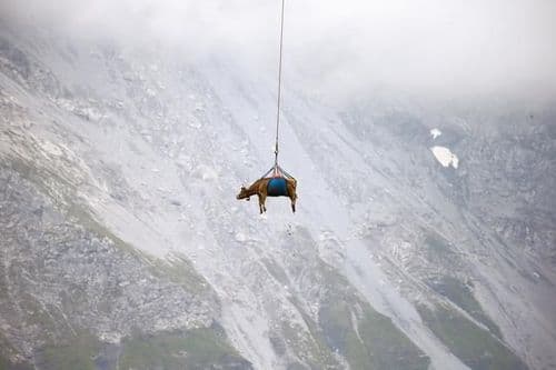 ४) हा फोटो स्वित्झर्लंडमधला आहे. उन्हाळी प्रवास संपल्यावर हेलिकॉप्टरच्या माध्यमातून एका गायीचे स्थलांतर करण्यात आले, त्याचा हा फोटो आहे. बघून सूर्यवंशम सिनेमामधलं एअरलिफ्ट आठवलं असेल.