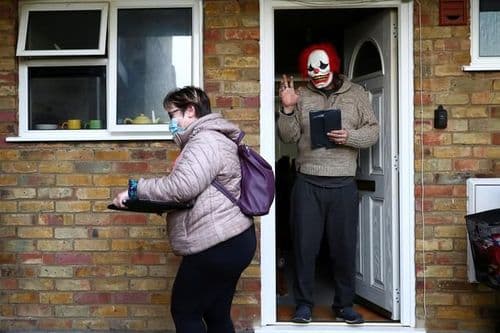 ५) ब्रिटनमध्ये कोविड स्वयंसेवकाला विचित्र मास्क घालून टाटा करताना एक गृहस्थ दिसत आहेत.