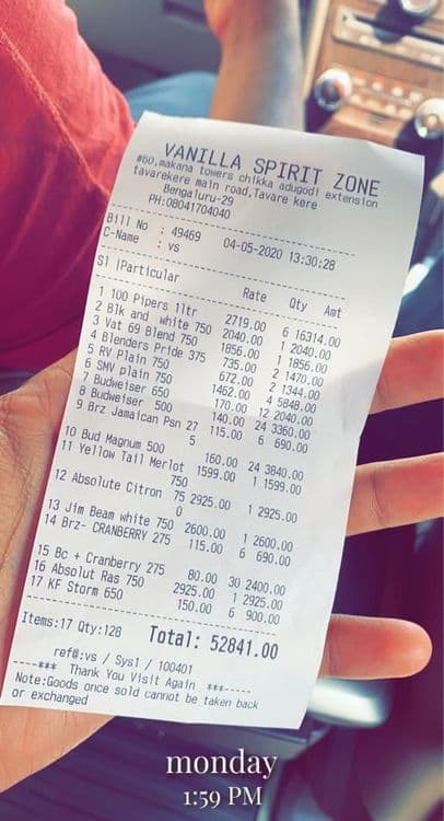 काल तिन्ही झोन मधली दारूची दुकाने काही नियम आणि अटी राखून उघडण्यात आली. एवढे दिवस दारूचा थेंब न मिळालेल्या मंडळींसाठी ही पर्वणीच होती. भल्या मोठ्या रांगा लावून लोकांनी खरेदी केली. एकट्या कर्नाटकात ४५ कोटींची मद्यविक्री झाली आहे भाऊ. ४५ कोटीत सर्वात मोठा हातभार असलेलं एक बिल सध्या व्हायरल होत आहे. या बिलमध्ये चक्क ५२,८४१ रुपये एवढ्या रकमेची दारू घेतल्याचा उल्लेख आहे.
