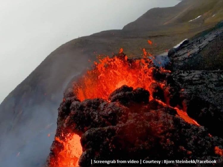 आइसलँडमधील ज्वालामुखीचे ड्रोन फुटेज ब्लॉगर ब्योर्न स्टेनबेक यांनी पोस्ट केले आहेत. लाल सूर्याचा गोळा जणू वितळून वाहत येतोय असा भास होतो हा व्हिडीओ बघून होतो. रिकॅनेस द्वीपकल्पातील फॅग्राल्डस (Fagradals) पर्वतावर या ज्वालामुखीचा उद्रेक झाला आहे. आईसलँड हवामान कार्यालय (आयएमओ) च्या माहितीनुसार १९ मार्च रोजी सकाळी ८.४५ वाजता हा स्फोट सुरू झाला. उद्रेक होण्याच्या काही तासांपूर्वी १.२ किमीजवळ ३.१ रिश्टर स्केलचा भूकंपही झाला होता.