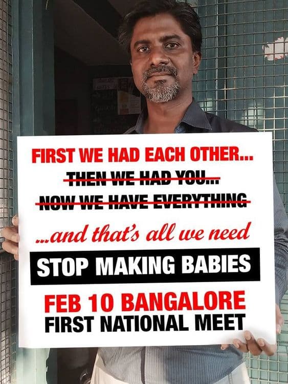या चळवळीचं नाव आहे ‘स्टॉप मेकिंग बेबीज’ ज्याला मानवी विलुप्तता आंदोलनही म्हटलं जात आहे. या चळवळीचं एकंच ब्रीदवाक्य आहे ‘मुलांना जन्म देऊ नका’. १० फेब्रुवारीला चळवळीचे कार्यकर्ते बंगलोर मध्ये पहिली ‘राष्ट्रीय’ सभा घेणार असून आंदोलनही करणार आहेत. आंदोलनकर्त्यांना “चाईल्ड फ्री” म्हणजे बालक विरहित समाज तयार करायचा आहे.
