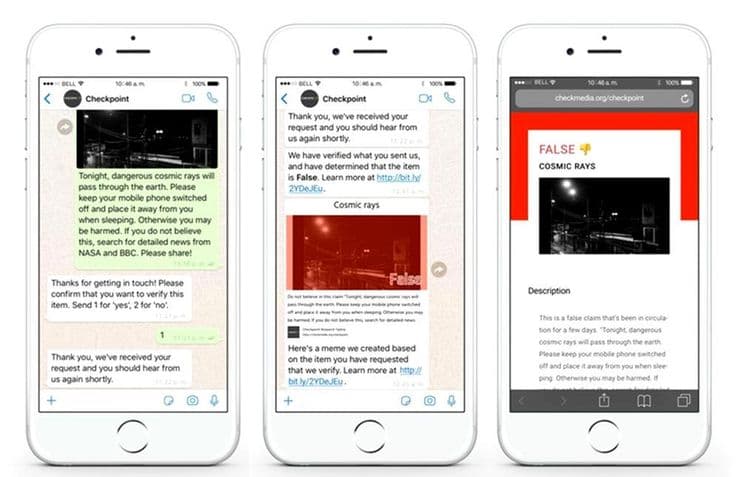 व्हॉटसअॅप तर्फे अधिकृतरीत्या +91-9643-000-888 हा क्रमांक देण्यात आलाय. या क्रमांकाला Checkpoint Tipline Number म्हणतात. मेसेजचा खरेपणा तपासण्यासाठी तो मेसेज या क्रमांकावर फॉरवर्ड करायचा आहे. तुम्ही कोणताही मेसेज तपासून घेऊ शकता. अगदी एखाद्या लेखापासून ते फोटो, URL, डॉक्युमेंट फाईल असे सर्व प्रकारचे मेसेज तपासले जातील.