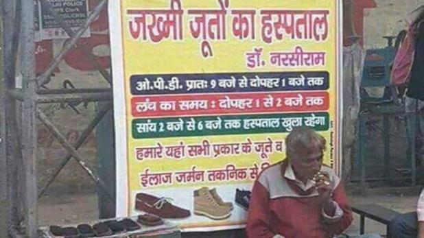 या व्यक्तीचं नाव आहे नरसिराम. त्यांनी स्वतःच्या दुकानाला हॉस्पिटल ठरवण्याबरोबरच स्वतःच्या नावापुढे डॉक्टर सुद्धा जोडलं आहे. पुढे त्यांनी लिहिलंय, ‘हे दुकान २ ते ६ पर्यंत उघडं राहील आणि इथे जर्मन पद्धतीने चपलांवर इलाज केला जाईल.’