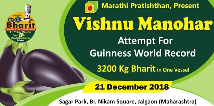 मंडळी, सलग 56 तास स्वयंपाक आणि तीन हजार किलो खिचडी तयार करणारे मराठमोळे शेफ विष्णू मनोहर आठवतायत का ? आज त्यांनी आणखी एक जबरदस्त रेकॉर्ड केला आहे. यावेळी त्यांनी गिनीज बुक ऑफ वर्ल्ड रेकॉर्डसाठी तब्बल ३२०० किलो जळगावी वांग्याचं भरीत तयार केलंय. आज पहाटेपासूनच विष्णू मनोहर आपल्या फौजेसाहित भरीत तयार करण्याचं काम करत होते.