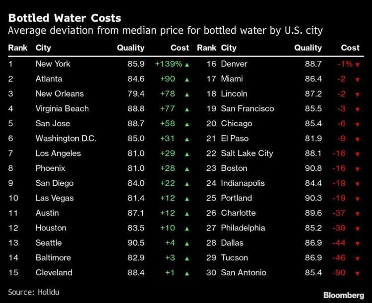 अमेरिकेच्या वेगवेगळ्या शहरात आणि जगभरातल्या इतर शहरात पाण्याची किंमत कशी बदलते याचा अभ्यास करून यादी काढण्यात आली. यामध्ये जगात सर्वात महाग पाण्याची बाटली मिळणारी ५ शहरं आणि सर्वात स्वस्त पाण्याची बाटली मिळणारी ५ शहरं खालील प्रमाणे आहेत.