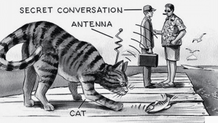 १९६०च्या दरम्यान अमेरिका आणि रशिया यांचे शीतयुध्द जोरात होते.अमेरिकेतल्या रशियन वकीलातीतल्या नोकरशाहीवर आणि इतर रशियन लोकांवर लक्ष ठेवायच्या नवनव्या युक्त्या केल्या जायच्या.असाच एक गंमतीदार प्रयोग म्हणजे ऑपरेशन अॅकॉस्टिक किटी (Operation Acoustic Kitty).या प्रयोगात शत्रूंवर लक्ष ठेवण्यासाठी चक्क मांजरीचा वापर करण्यात आला होता. १९६७ सालच्या "Views of Trained Cats" नावाच्या एका सरकारी कागदपत्रात या 'मांजर' प्रयोगाचा उल्लेख आहे.