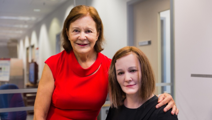 ( प्रोफेसर नादिया, नदीनसोबत. ओळखा पाहू कोणता रोबो आहे? - स्रोत)