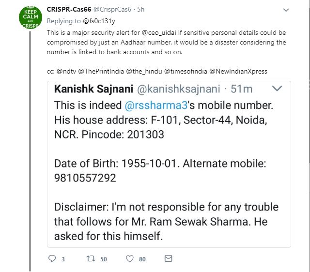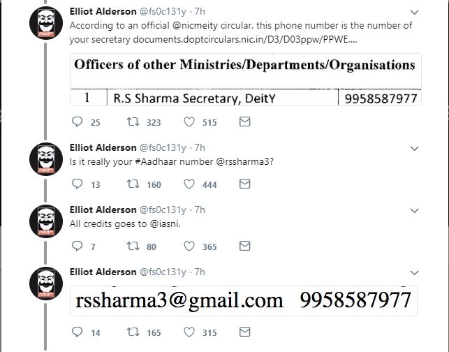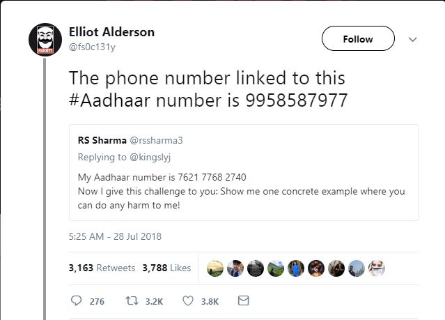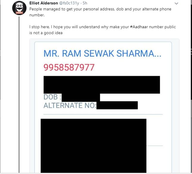 एलियट एल्डरसन नावाच्या फ्रेंच सिक्युरिटी संशोधकाने त्यांचा फोन नंबर, जन्मतारीख, पत्ता आणि इतर व्यक्तिगत माहिती आधार कार्डावरुन मिळवलीय. अर्थात, त्यानं बरेचशी माहिती ब्लर करुन ती ट्विट केलीय. वरती शर्माकाकांना सल्लाही दिलाय, "इतक्य्ता सहजपणे इंटरनेटवर तुमचा फोन नंबर, जन्मतारीख, पत्ता आणि बँकेतल्या खात्यांची माहिती उपलब्ध असेल, तर तुम्हाला काहीच प्रायव्हसी नाहीय". त्याचं म्हणणं आहे की तो आधारच्या विरोधात नाही, पण आधार हॅक करताच येणार नाही असं म्हणणाऱ्यांच्या नक्कीच तो विरोधात आहे.