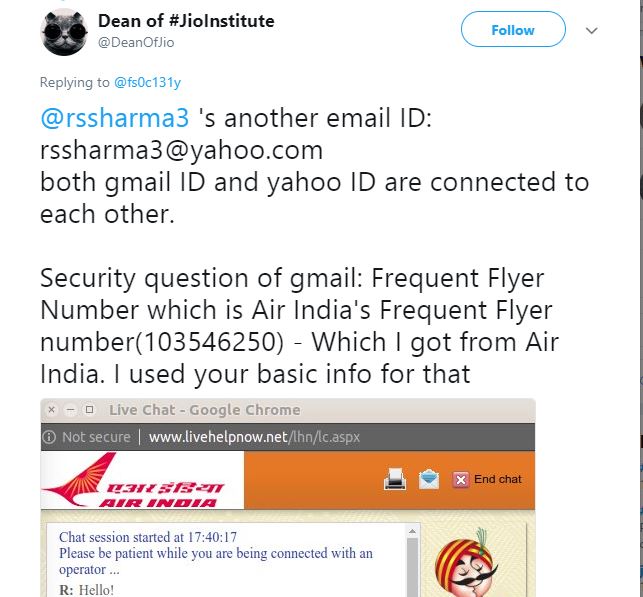 एका डीन ऑफ जिओ इन्स्टिट्यूट या नावाच्या ट्विटर युझरने तर आणखीच कमाल केलीय. शर्मांच्या जीमेलच्या सिक्युरिटी प्रश्नाची हिंट त्याने हॅक केली. ती होती त्यांचा एअर इंडियाचा फ्रिक्वेंट फ्लायर नंबर. तो काय आहे हे जाणून घेण्यासाठी त्याने हॅक केलेली जन्मतारीख, जीमेल ॲड्रेस आणि इतर माहिती वापरली आणि त्यांच्या सिक्रेट प्रश्नाचं उत्तर त्याला मिळालं की हो..