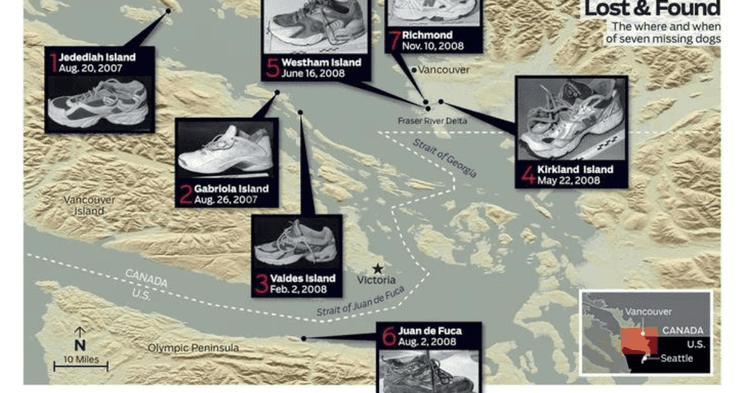 त्या दिवसापासून ब्रिटिश कोलंबिया, अमेरिका, येथील सॅलिश समुद्राच्या किनार्यावर पायापासून वेगळी झालेली कमीतकमी २० पावलं सापडली होती.