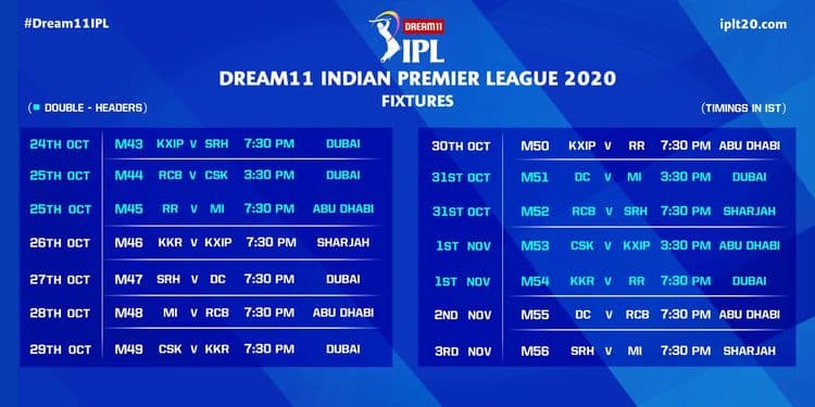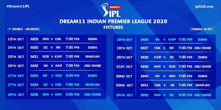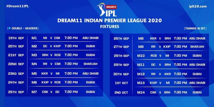 सर्वांचे लक्ष लागून असलेल्या ड्रीम 11 आयपीएल २०२० च्या वेळापत्रकाची शेवटी घोषणा झाली आहे. कोरोनामुळे यंदा युनायटेड अरब अमिरातीमध्ये प्रेक्षकांशिवाय होणारी ही पहिलीच स्पर्धा!! २०१४ नंतर दुसऱ्यांदा यूएईत या स्पर्धा भरविण्यात येत आहेत. १९ सप्टेंबर रोजी अबूधाबी येथे मुंबई आणि चेन्नईमधील धमाकेदार सामन्याने स्पर्धेला सुरूवात होणार आहे. भारतीय वेळेनुसार संध्याकाळी ७:३० वाजेला स्पर्धेला सुरुवात होईल.