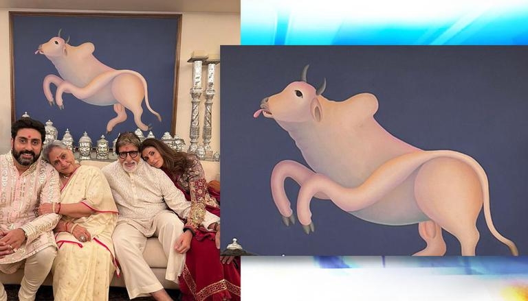 अमिताभ बच्चन यांनी शेअर केलेल्या फोटोमध्ये त्यांच्यासोबत पत्नी जया बच्चन, अभिषेक बच्चन, ऐश्वर्या राय, श्वेता बच्चन, अगस्त्य नंदा आणि नव्या नंदा दिसत आहेत. त्यांच्या मागे भिंतीवर एक मोठं पेटिंगही दिसत आहे. यामध्ये एक भला मोठा बैल दिसून येत आहे. हे पेटिंग पाहायला खूपच वेगळे वाटते आणि तुम्ही लक्ष देऊन पाहिलं तर बैलाचा पुढचा पाय आणि त्याची शेपूट ही एकत्र जोडल्याचं दिसत आहे. यामुळे सर्वांचं लक्ष या पेटिंगकडे गेले. आपण घरात पळणाऱ्या घोड्याचे पेंटिंग खूपदा पाहतो, पण हे बैल आणि तोही असा वेगळा?