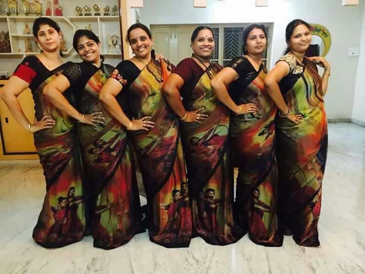 या कल्पनेमागे सुपीक डोकं आहे ते सुप्रसिद्ध तेलगु लेखिका रजनी शकुंतला यांचं. आता या कोण आहेत हे आम्हाला माहीत नसलं तरी तिकडे त्या फेमस आहेत. तर यांच्याकडून आपल्या मैत्रीणींसाठी इलुरू प्रिंटींग मिलला ५० साड्यांची अॉर्डर देण्यात आली. ज्यावर बाहुबली (प्रभास) आणि देवसेना (अनुष्का शेट्टी) यांच्या फोटोचं डिझाईन छापलं आहे. या साड्या नेसूनच या बायका बाहुबलीचा फर्स्ट शो बघायला गेल्या. धन्य तो बाहुबली!!