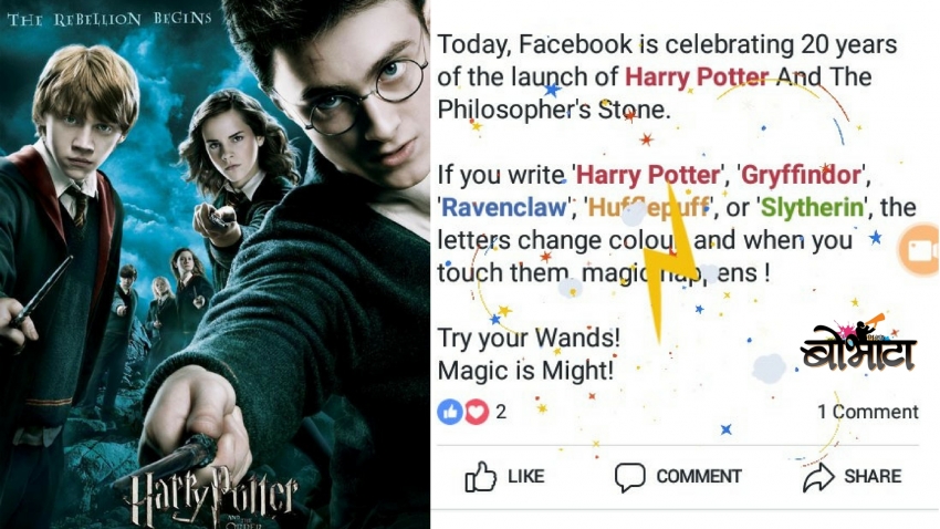 हॅरी पॉटरच्या आठवणींना उजाळा देण्यासाठी फेसबुकने अनोखी शक्कल लढवली आहे. फेसबुकने एक असं फिचर आणलाय ज्यामुळे आपण 'Harry Potter', 'Gryffindor', 'Ravenclaw', 'Hufflepuff', किंवा 'Slytherin' यापैकी काहीही फेसबुकवर लिहू आणि त्यावर जेव्हा क्लिक करू तेव्हा एक जादूची छडी प्रकट होऊन संपूर्ण स्क्रीन वर जादू पसरवते. आहे कि नाही गम्मत.