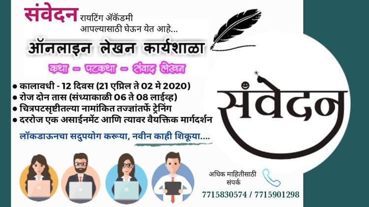तर मग 'संवेदन रायटिंग अकॅडमी' घेऊन येत आहे मनोरंजन क्षेत्रात लेखक म्हणून येऊ पाहणाऱ्यांसाठी एक ऑनलाइन व्यासपीठ! ते शिकवतील कथा पटकथा आणि संवाद लेखन कसे करायचे, आणि ते ही घरबसल्या ऑनलाइन पद्धतीने!